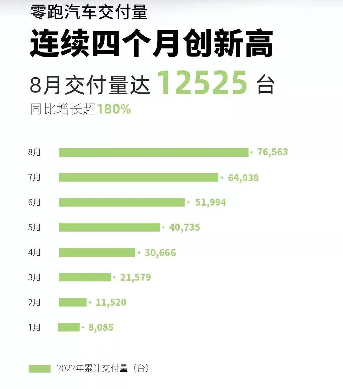 值得關注的是,雖然業績虧損連連,但是零跑(pao)汽(qi)車的銷量卻在逐(zhu)漸走高,數據顯(xian)示(shi),今(jin)(jin)年(nian)8月(yue)份零跑(pao)交付量達(da)到了12525輛(liang),同(tong)比(bi)增幅達(da)180%,今(jin)(jin)年(nian)1-8月(yue)累(lei)計(ji)銷量已達(da)7.6萬余(yu)輛(liang),從銷量上說,其表現(xian)還算(suan)不錯。