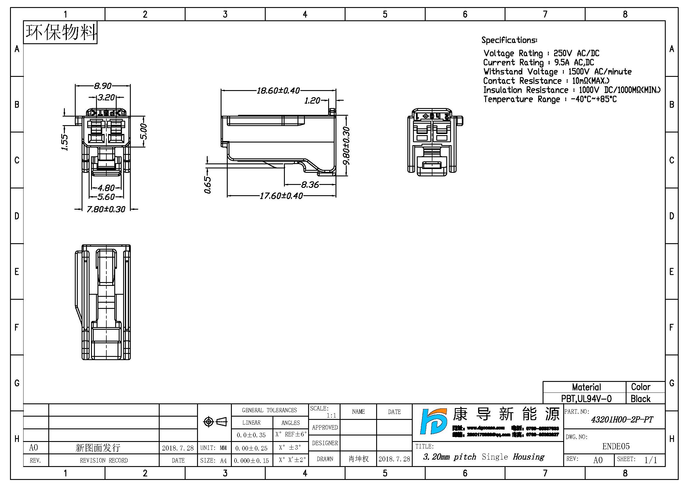 規(gui)格型號(hao):PH:3.20MM H:18.60MM 1*2P 線端公(gong)殼