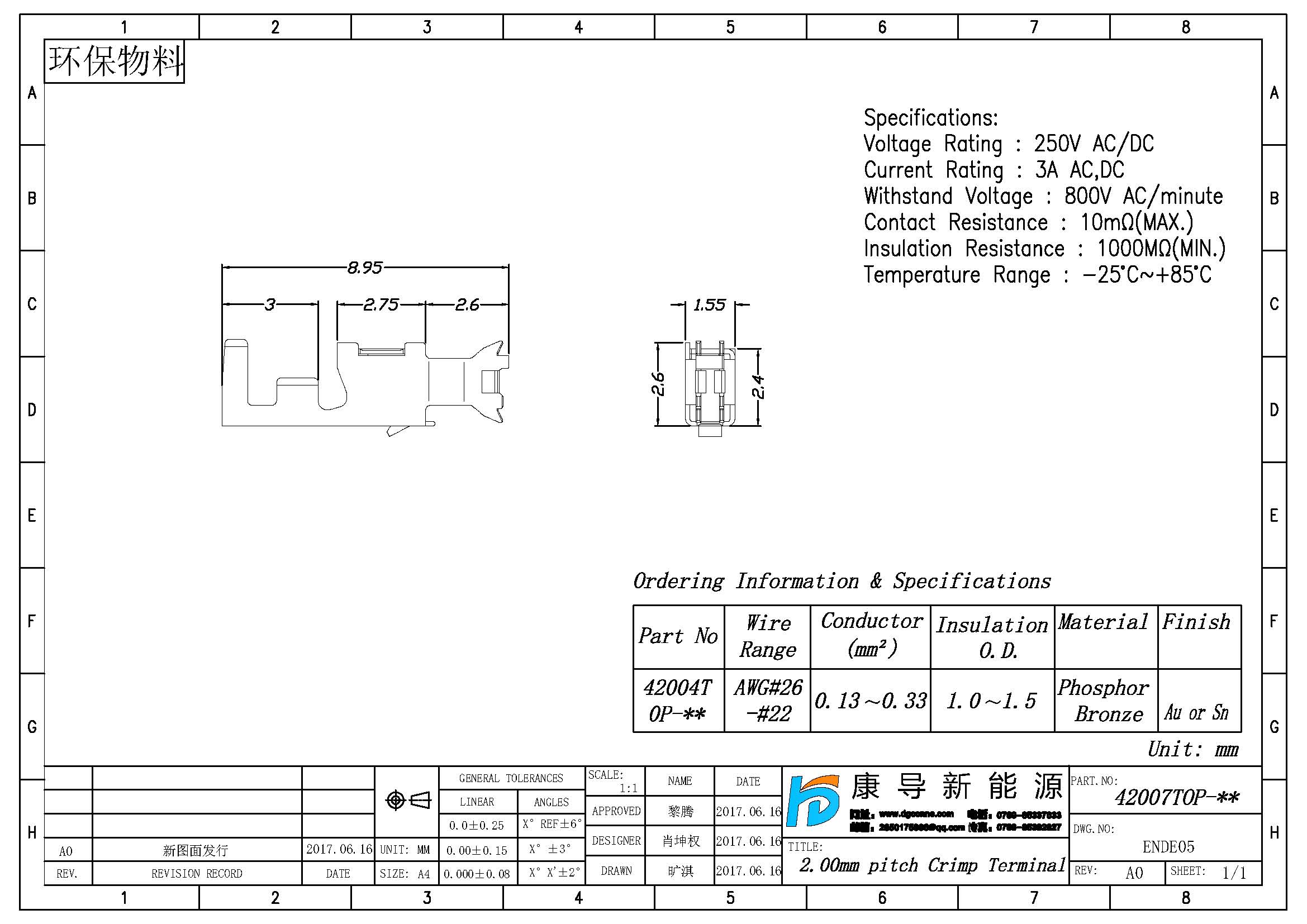規格型號(hao):PH:2.0MM L:8.95MM AWG22#-AWG26# 線端母端子