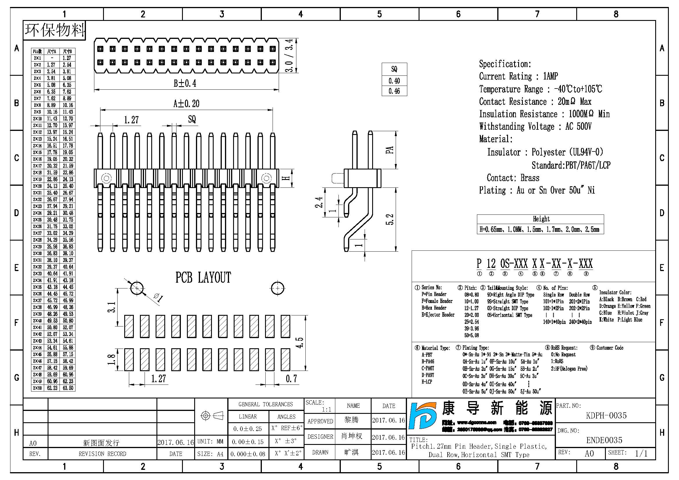 規格型號:PH:1.27MM 2*NP 臥貼 雙排單塑排針