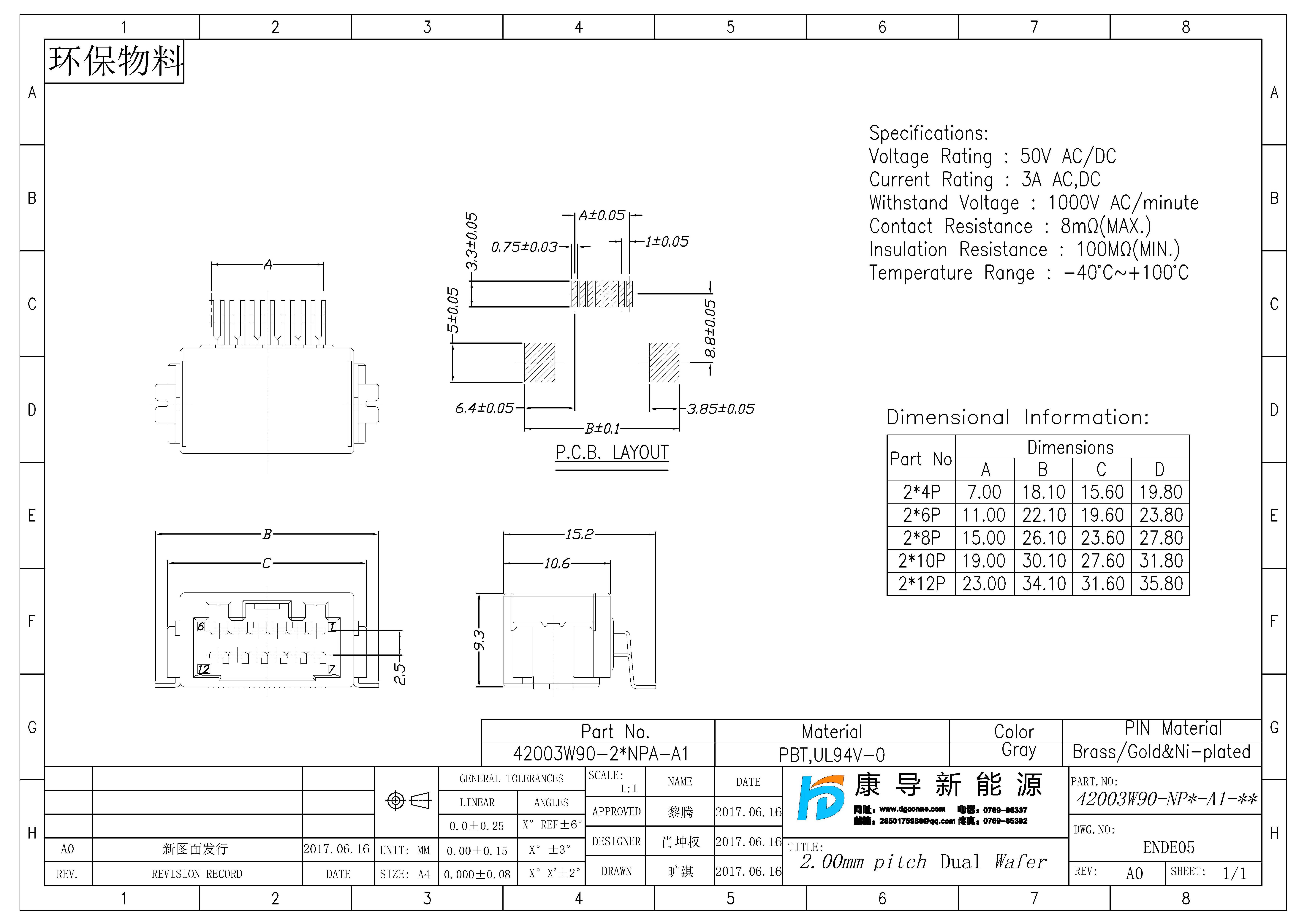 規(gui)格(ge)型(xing)號:PH:2.00MM H:9.30MM 2*NP 臥貼