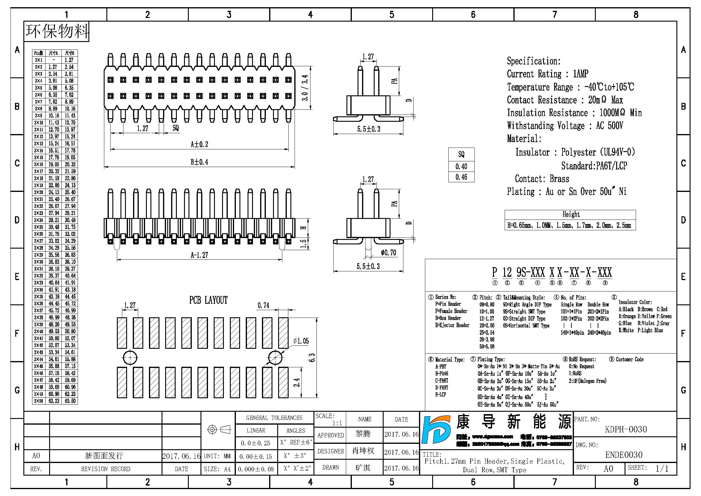規格型號:PH:1.27MM 2*NP SMT 雙排單塑排針