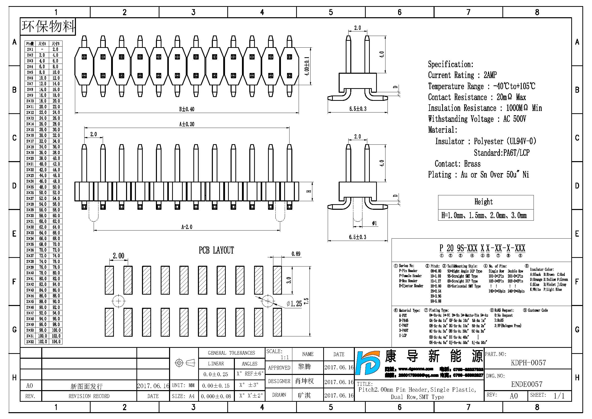 規格型號:PH:2.0MM 2*NP SMT 雙排單塑排針