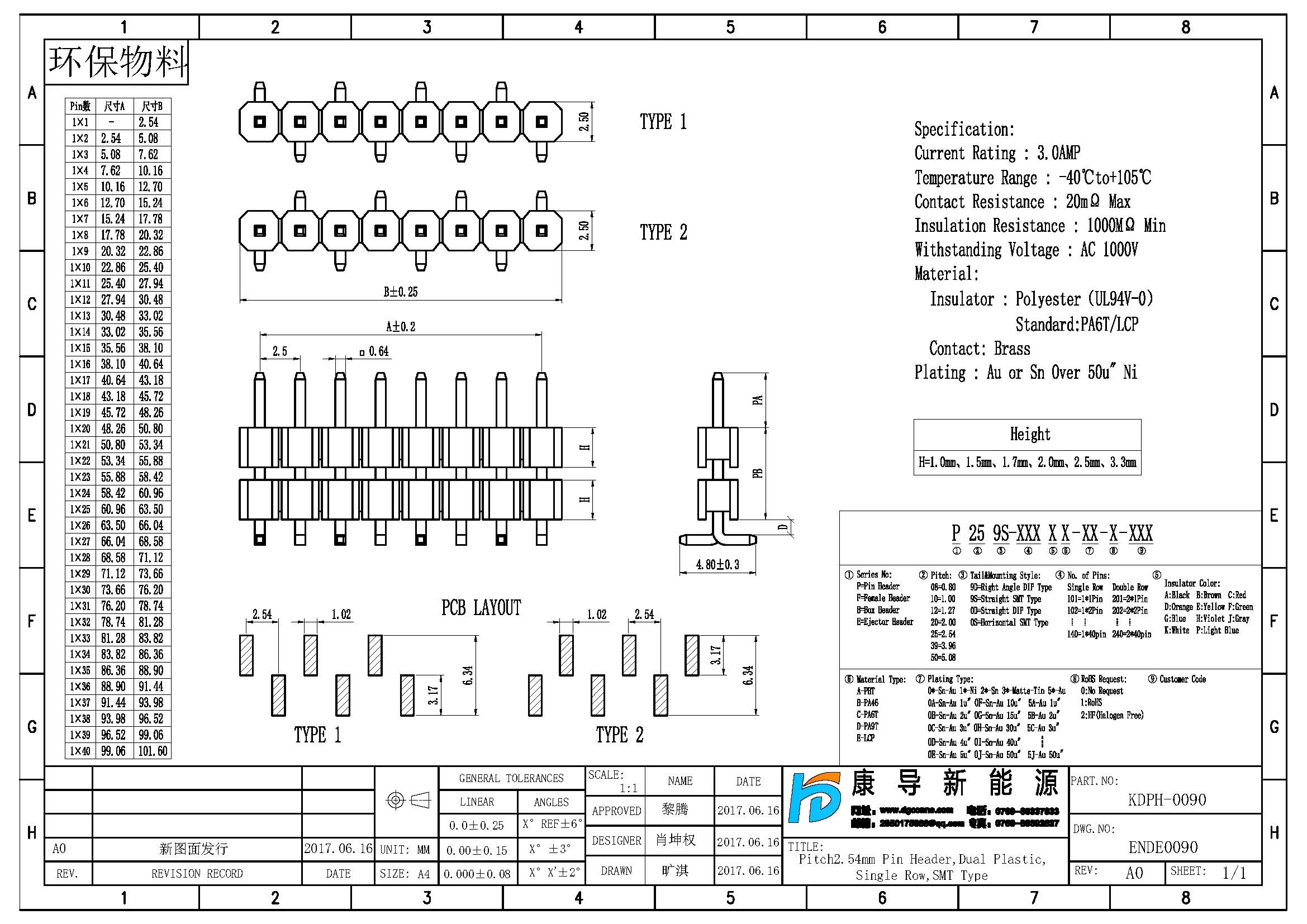 規格型號:PH:2.54MM 1*NP SMT 單排多塑排針